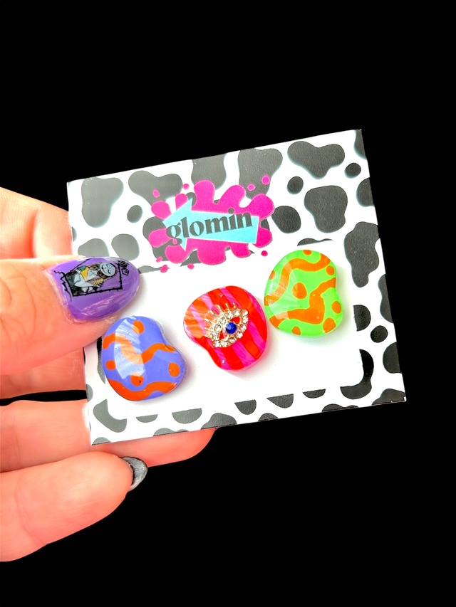 約1.5cmの1粒ピアスです★3つセットになります。ぷっくりツヤツヤでさりげなくカラフルを取り入れるファッションができます。 (金具はステンレス製) こちらのデザインはPOPな柄とめだまのストーンパーツがのった個性派デザインです