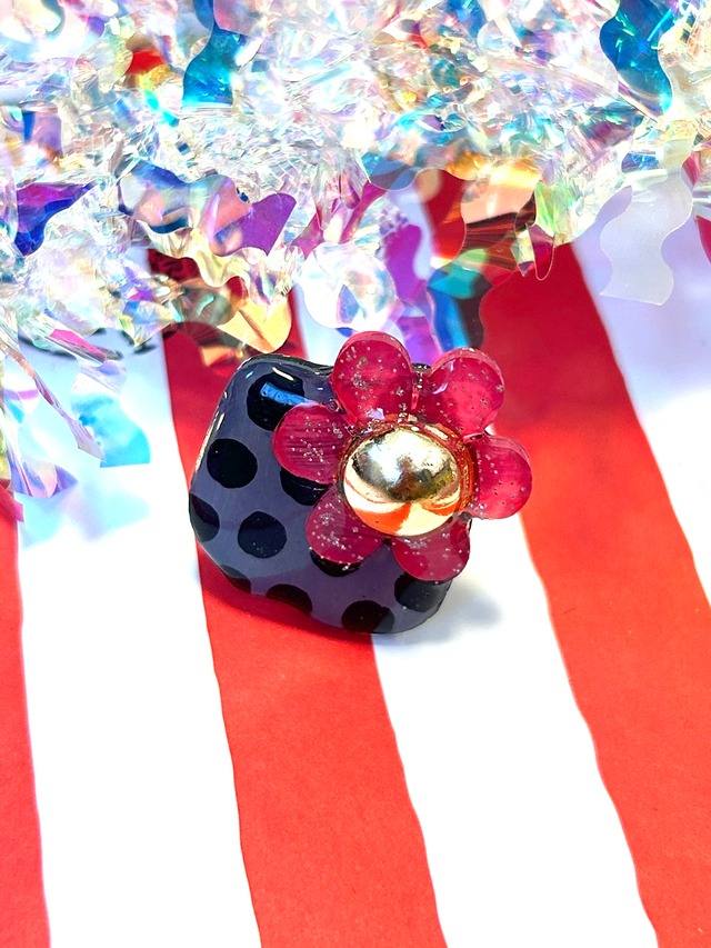 オミミノコイビト同様一つ一つ手描きしたリングです。 ツヤ感とPOPなデザインの大ぶりリングシリーズ! 金具はステンレスです。開閉式なのでサイズ調節が出来ます。 表だけではなく裏も丁寧に加工しています。接着剤とレジンの二重接着で強度を高くしています。