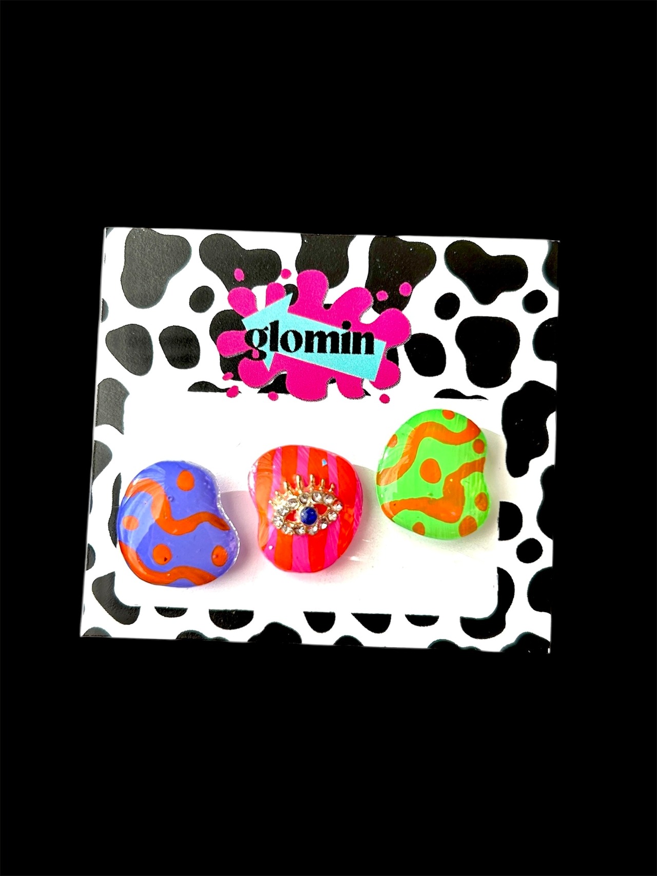 こちらのデザインはPOPな柄とめだまのストーンパーツがのった個性派デザインです