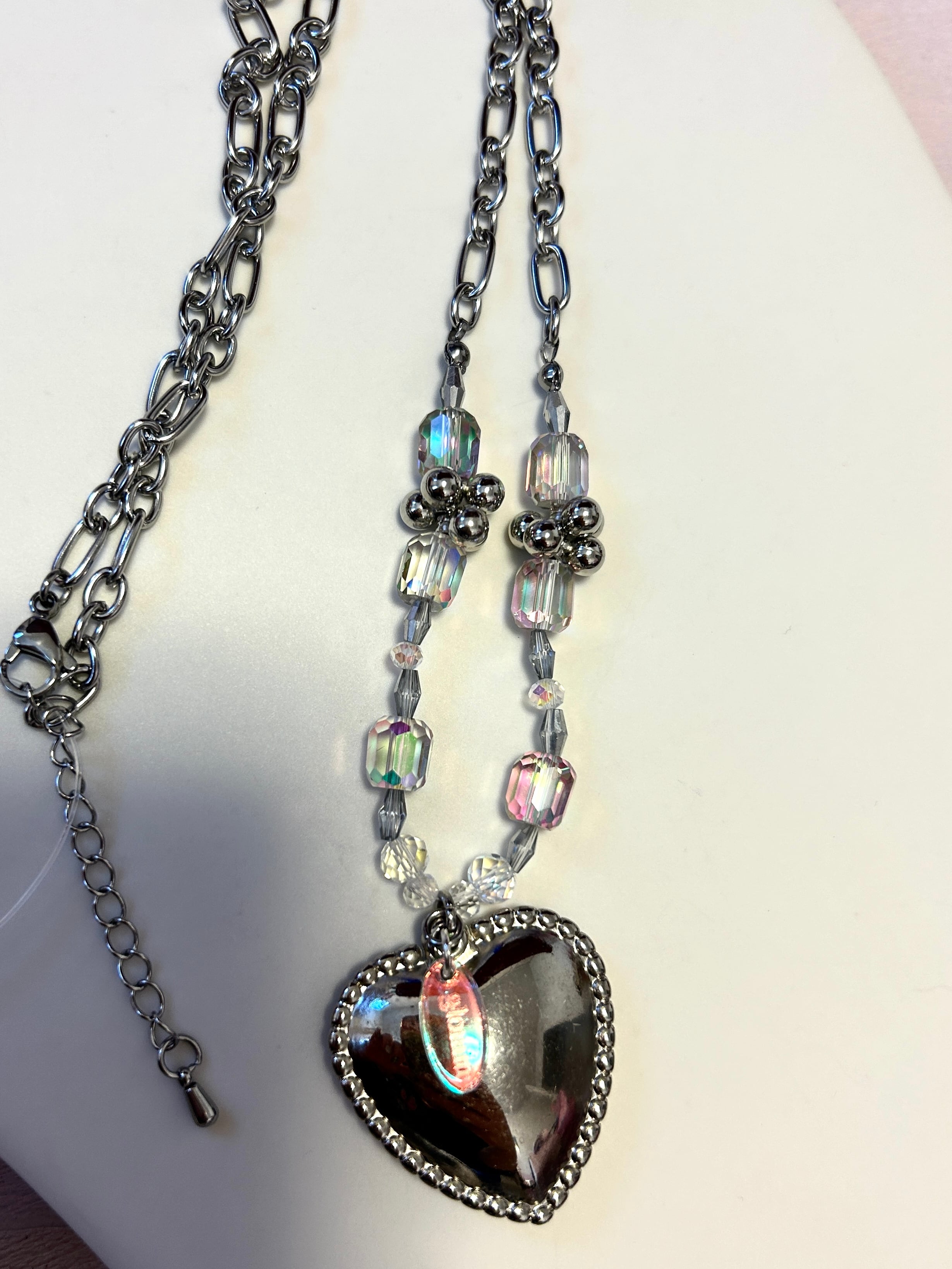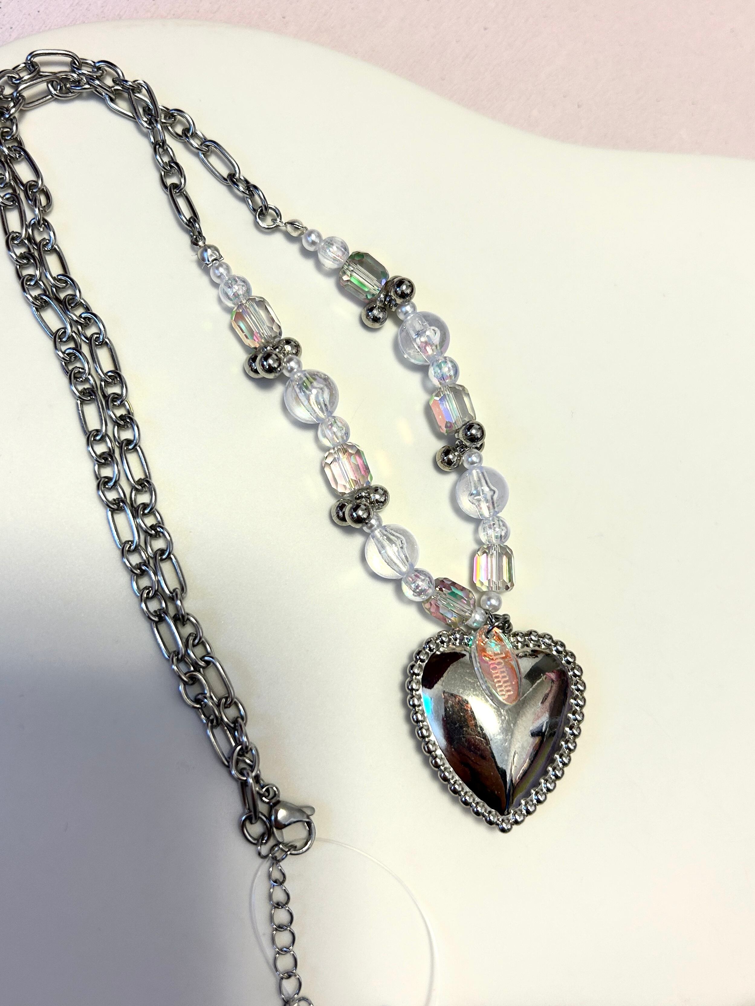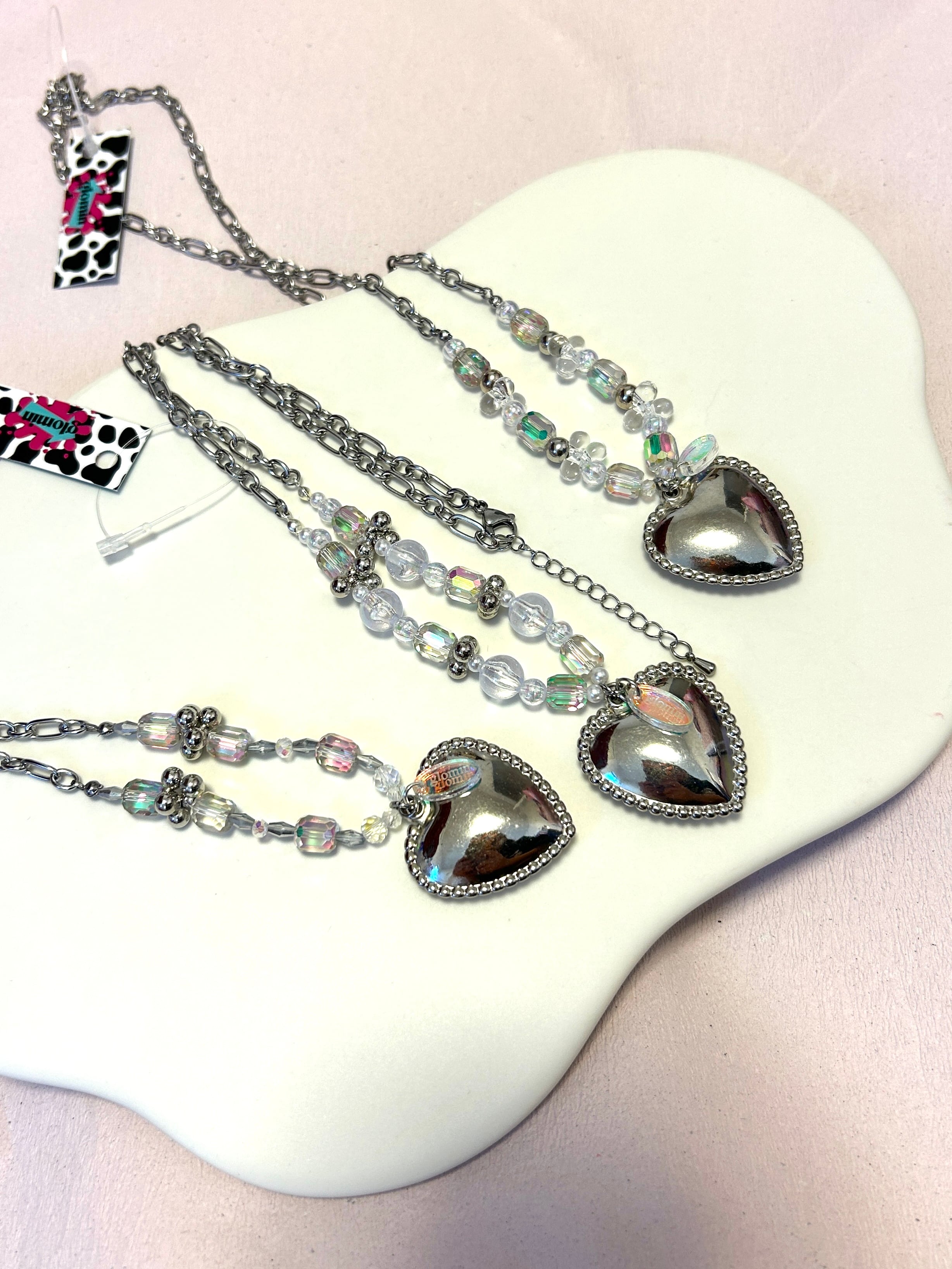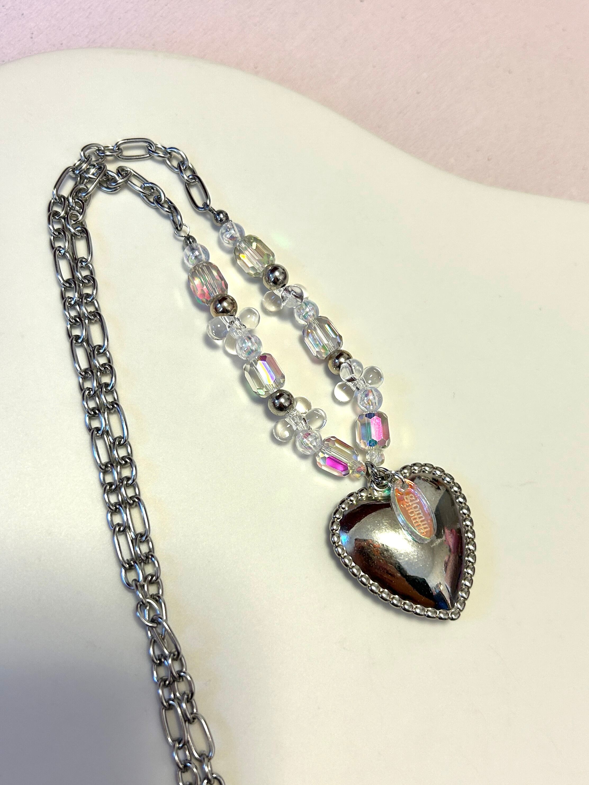 ステンレス製の太めのチェーンにギラギラしたビーズとトップには大きめのハートとglominのロゴを付けています。光に当てるとギラギラ輝きます!