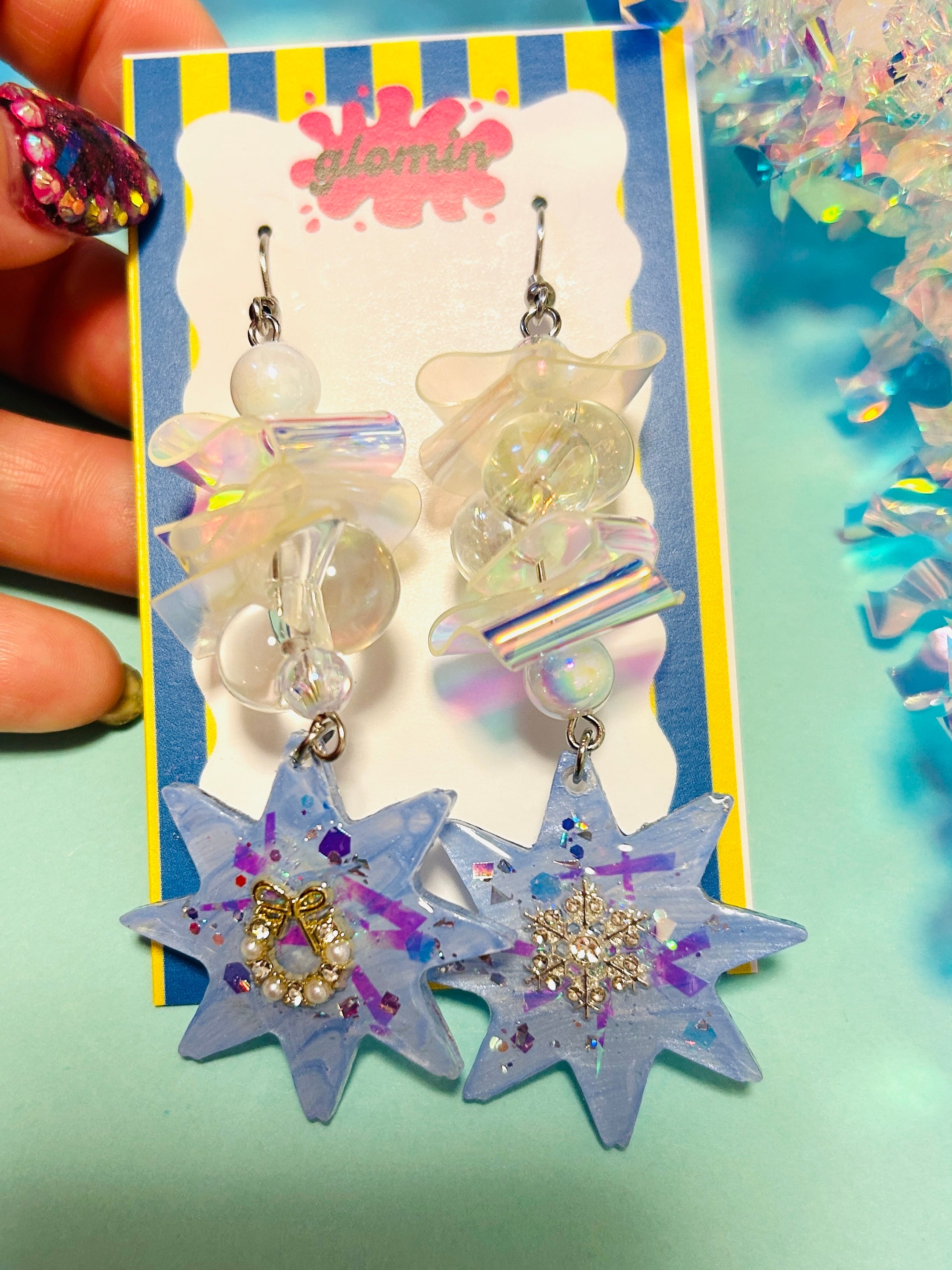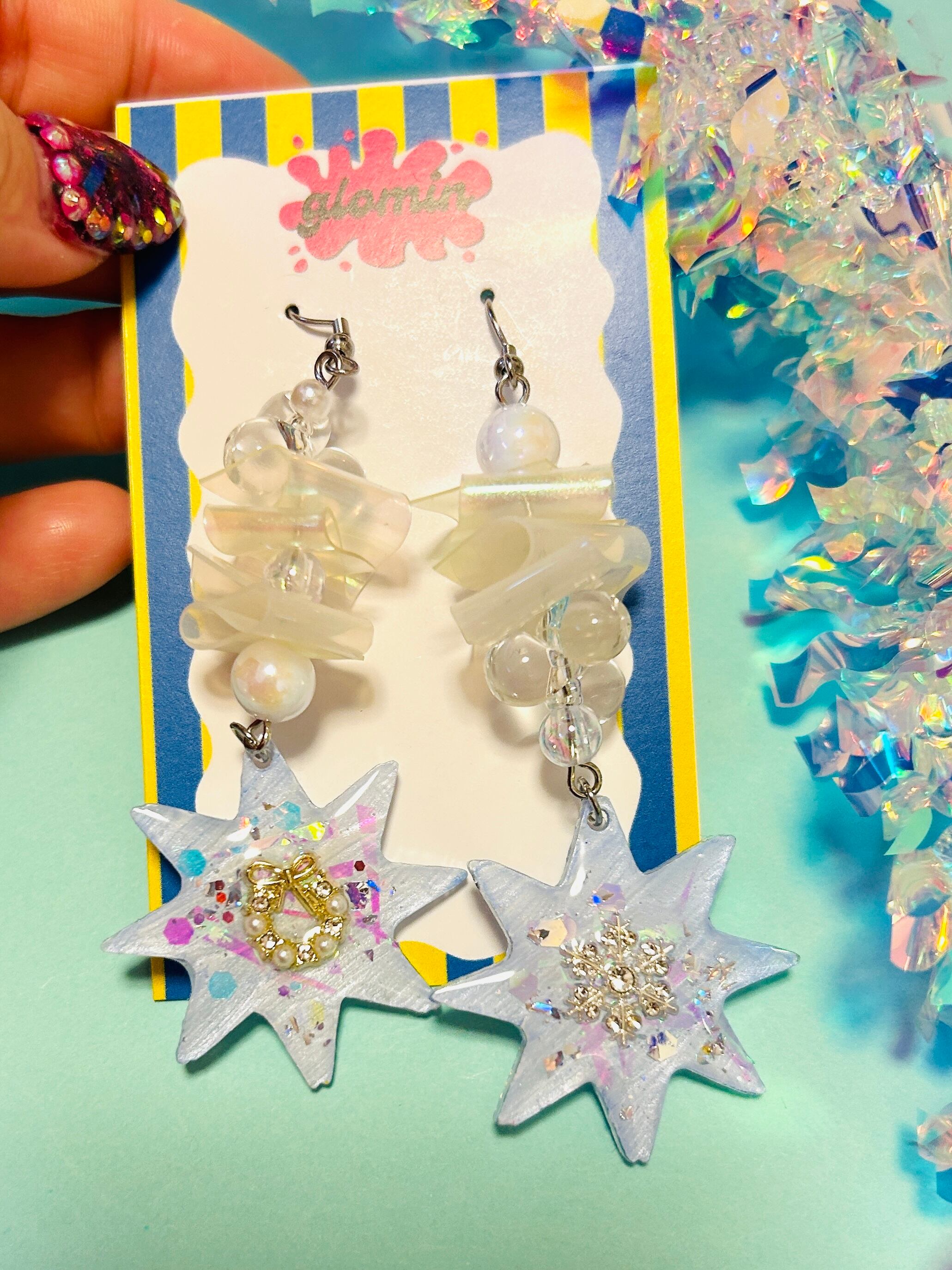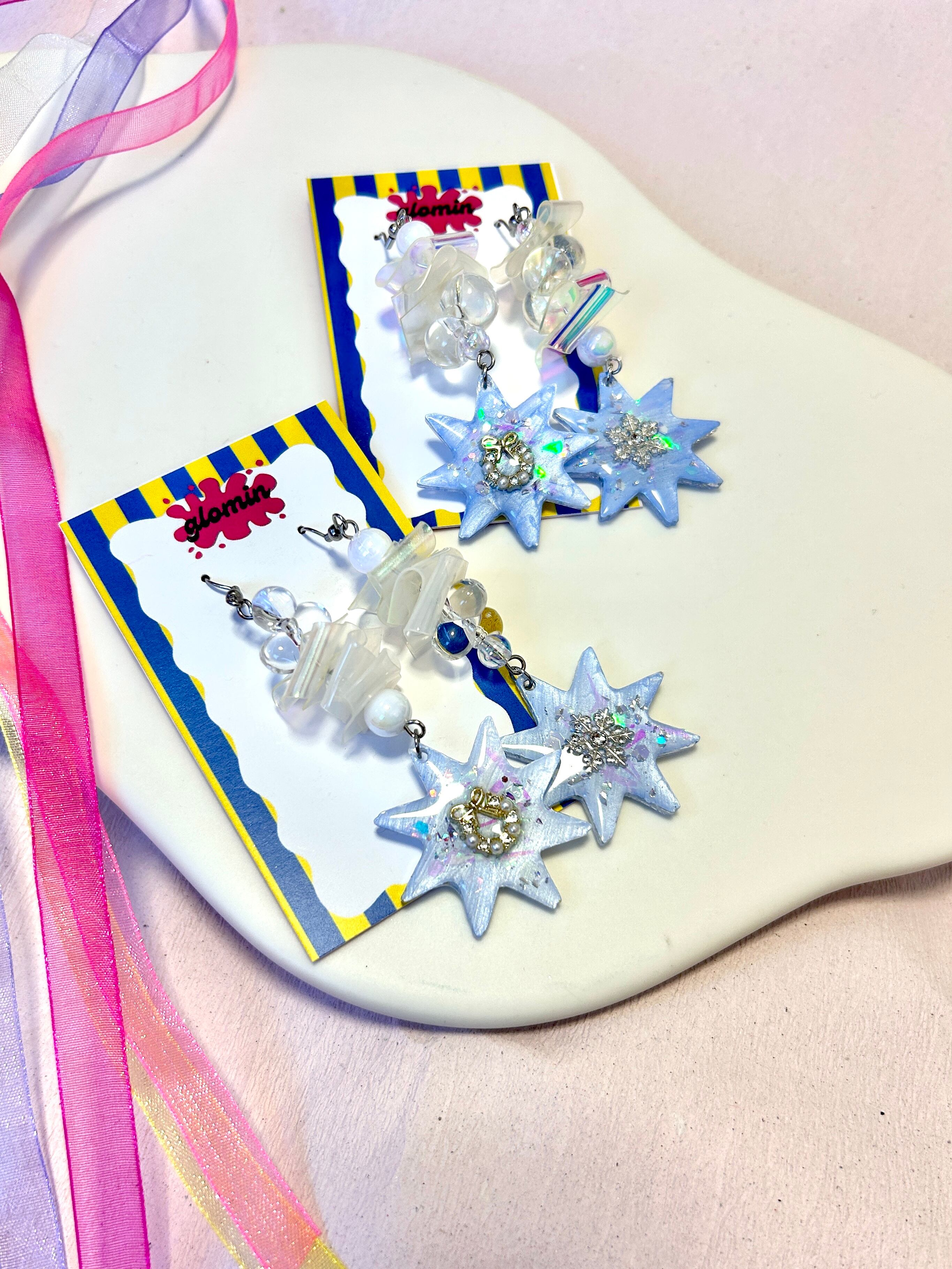 イヤリングはクリップタイプで痛み防止シリコンカバーもお付けします。ピアスはフックタイプです。