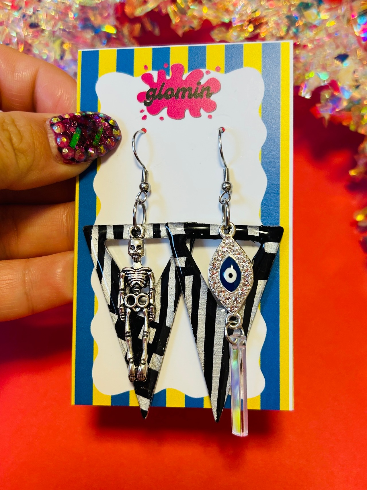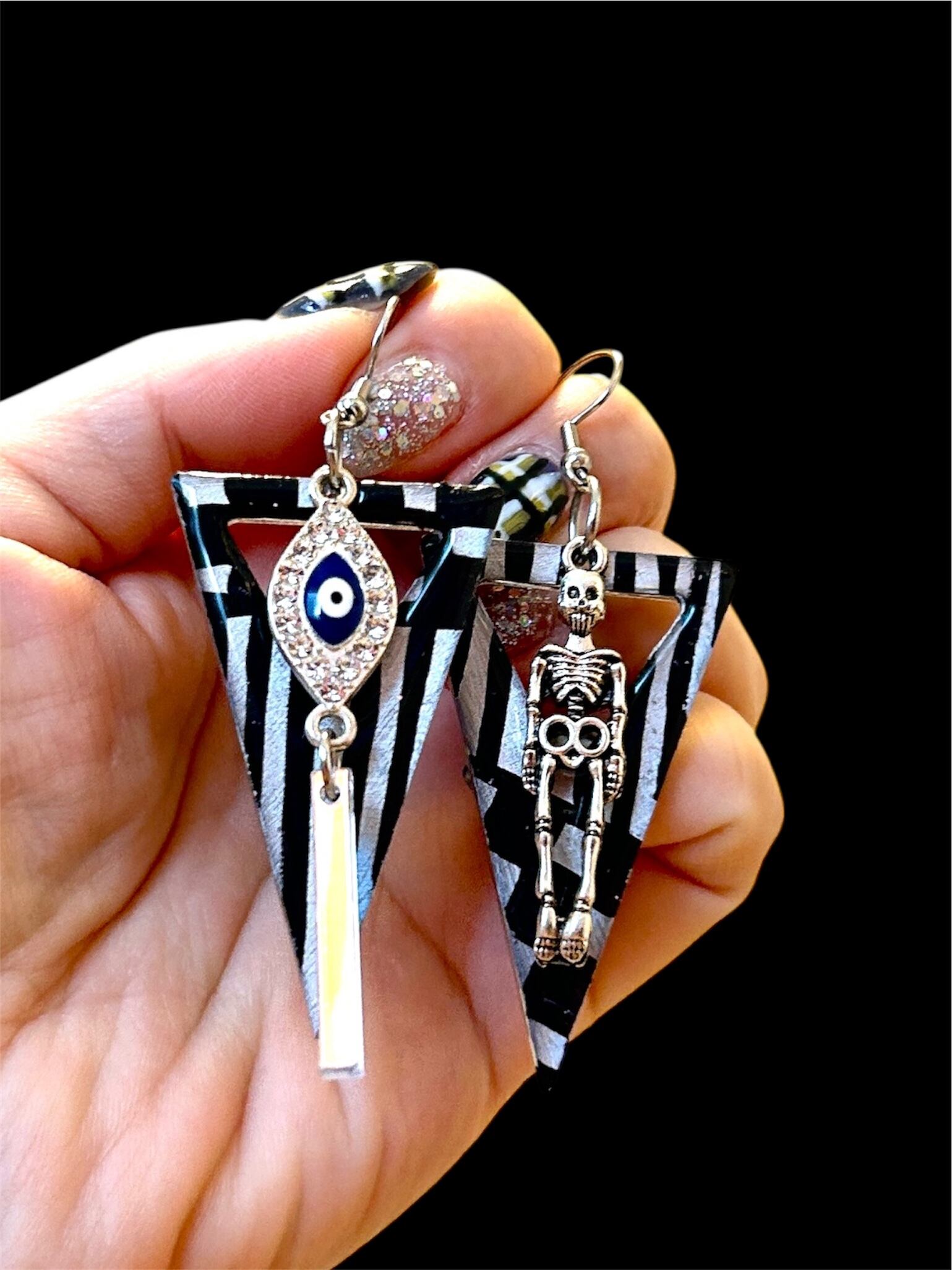 こちらはシルバーに黒ストライプ、個性的なパーツやオーロラをつけたデザインです。